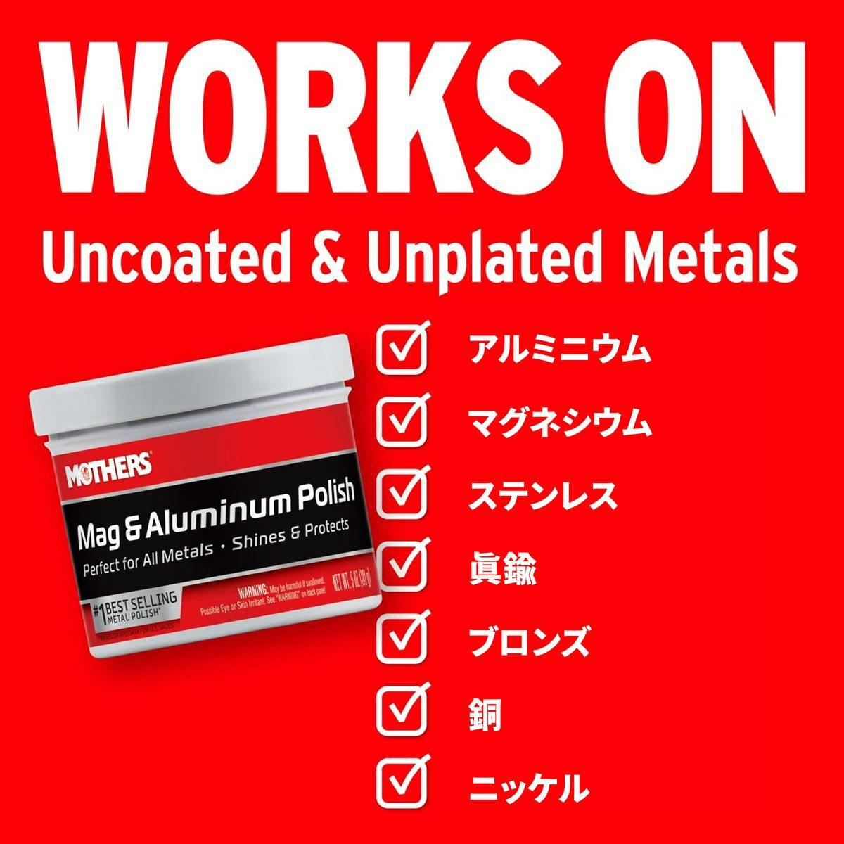 ●Mothersの独自のポリッシュ配合が、金属の表面にあるくすみや軽度の酸化をしっかり除去し、深みのある輝きをもたらします。高い光沢を長持ちさせたい方に最適です。●アルミやマグネシウムに限らず、ステンレスや真鍮などさまざまな金属に対応。自動車やバイクのホイールやエンジンパーツだけでなく、家庭内の金属製品にも使えるため、1本で多くのアイテムに輝きを与えます。