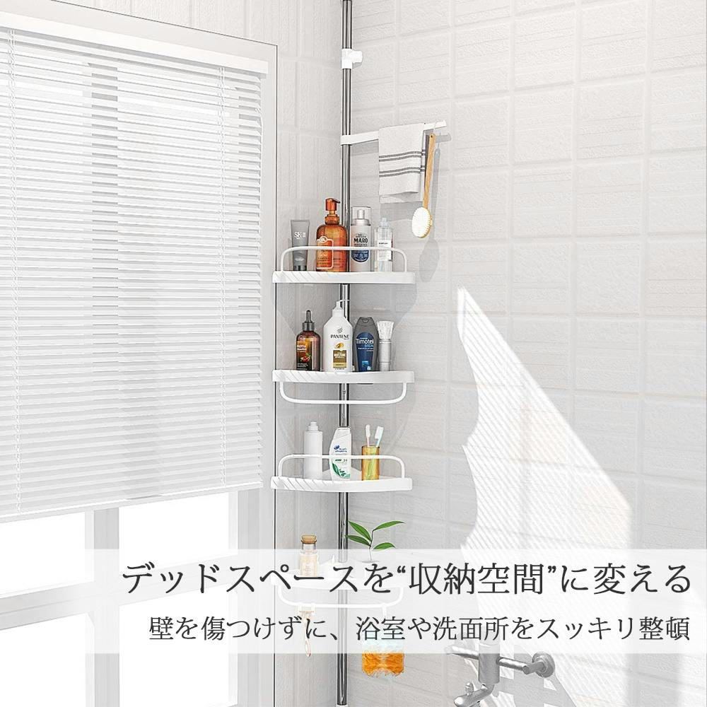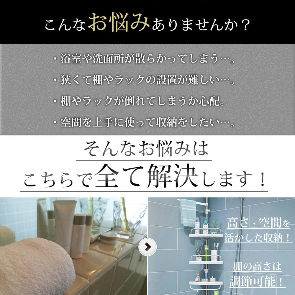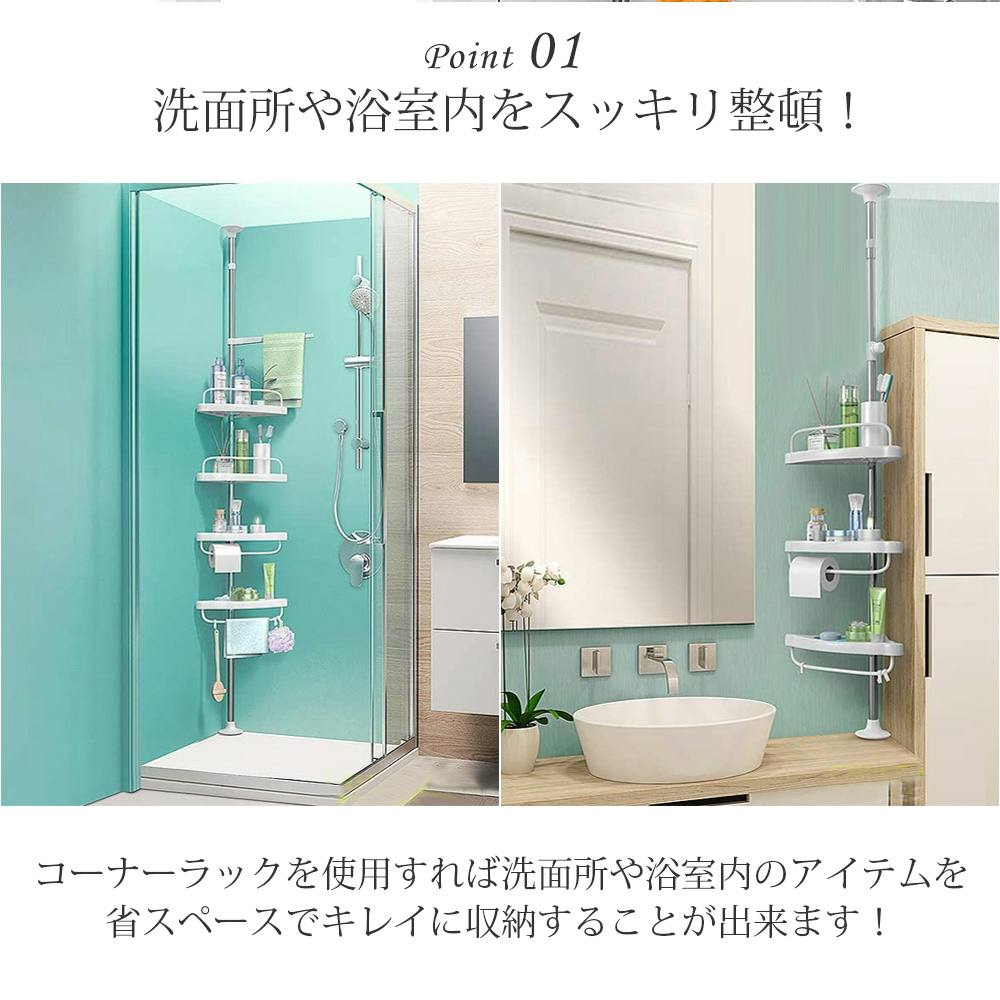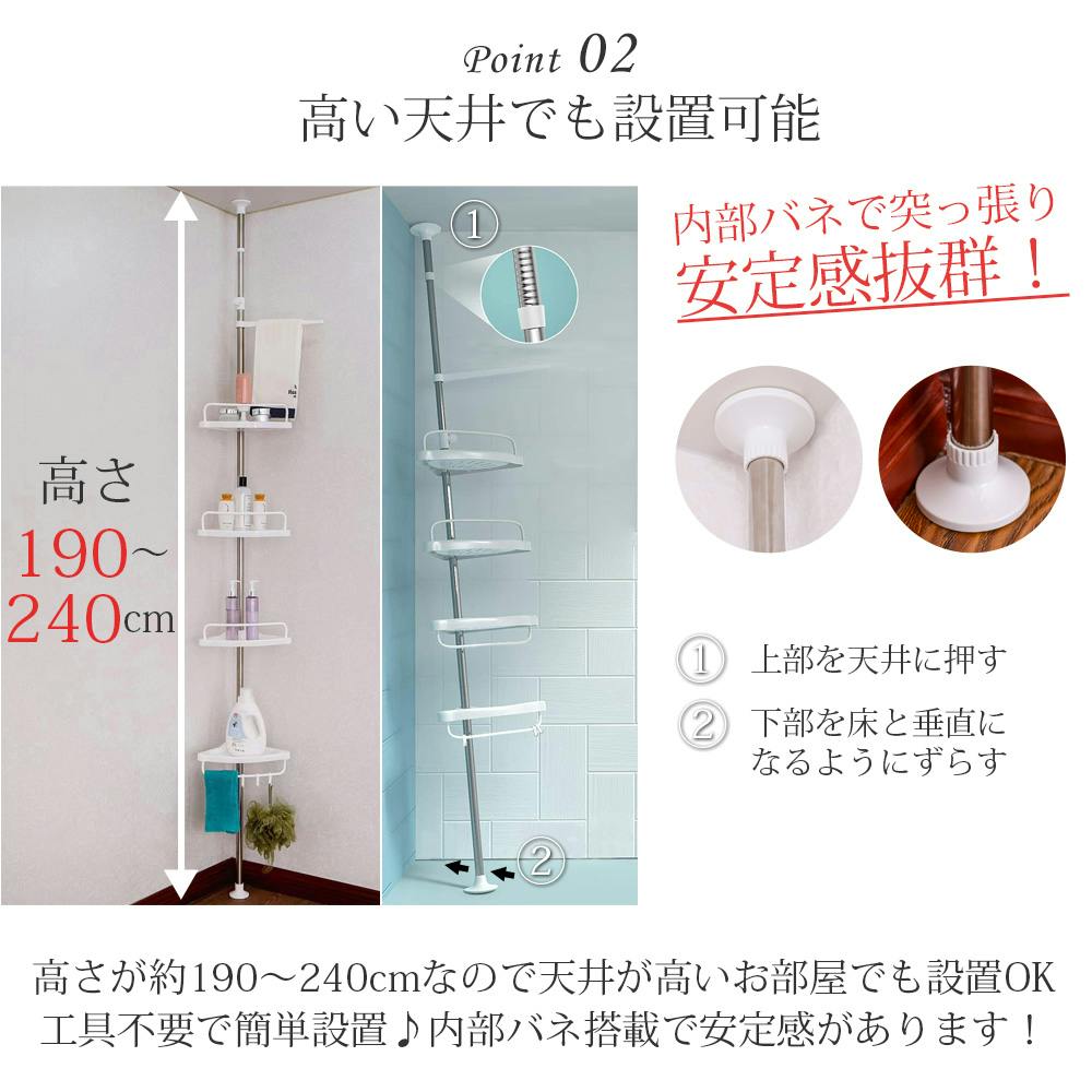 洗面所や浴室内をスッキリ整頓!コーナーラックを使用すれば洗面所や浴室内のアイテムを省スペースでキレイに収納することが出来ます!■高い天井でも設置OK/高さが約190~240cmなので天井が高いお部屋でも設置OK/工具不要で簡単設置♪内部にバネ搭載で突っ張りが強く、安定感があります!