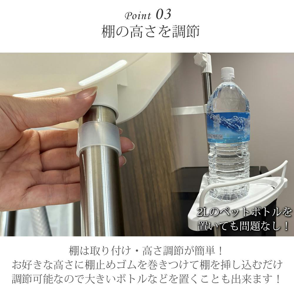 棚の高さ調整可能!棚は取り付け・高さ調節が簡単!お好みの高さに調節可能なので大きいボトルなどを置くことも出来ます!水切り穴でカビ防止に!棚には水切り穴が付いているため、浴室内でもカビにくく衛生的です。耐荷重約2kgで洗剤を置くのにもおすすめです!