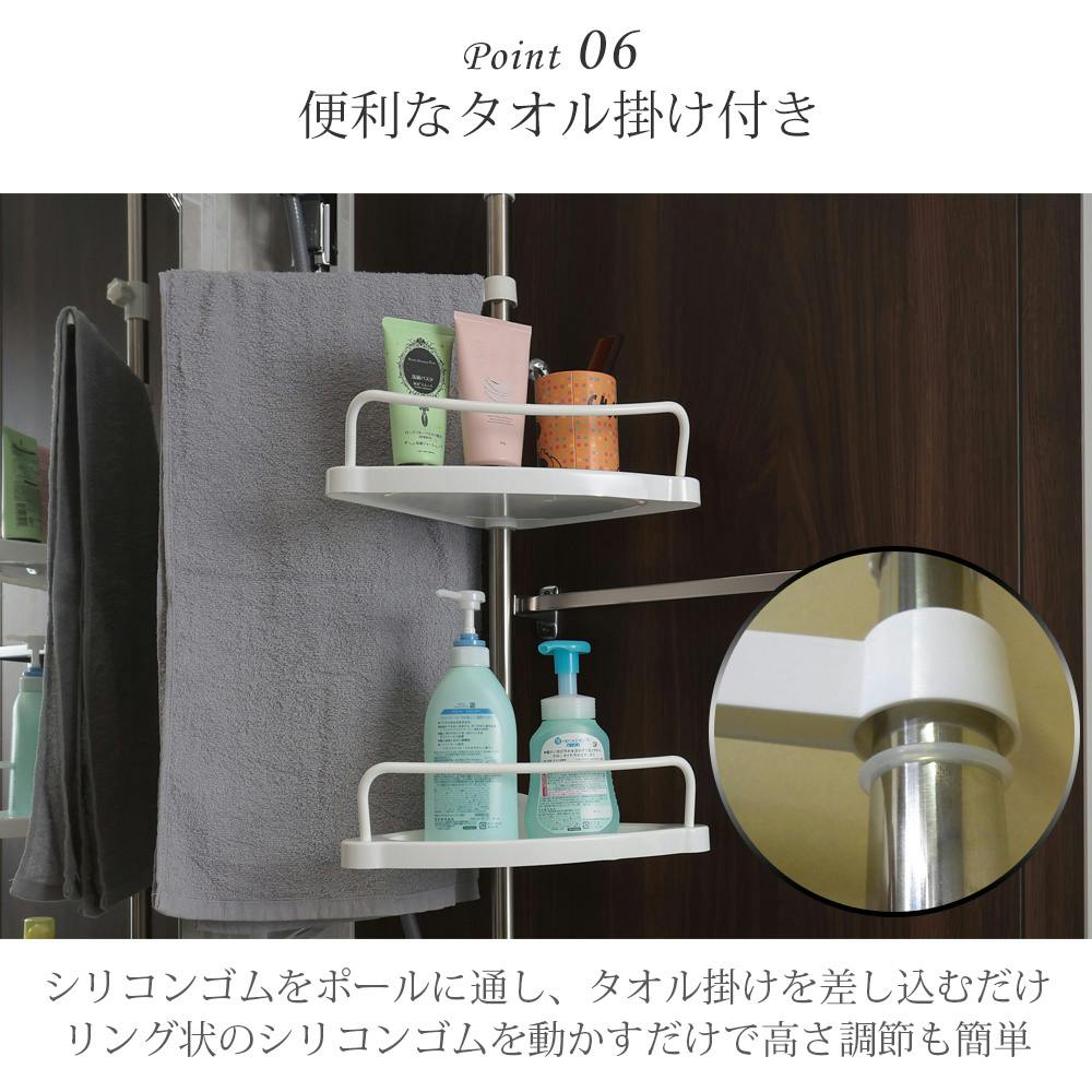 バーは2WAY仕様、便利なフック付き。上向き、下向きどちらでも設置OK!アイテム落下防止柵や引っ掛け収納バーとして使えます。便利なタオル掛け付き。シリコンゴムで簡単高さ調節。自由に高さが変更できるのでタオルやお風呂用品の収納に◎