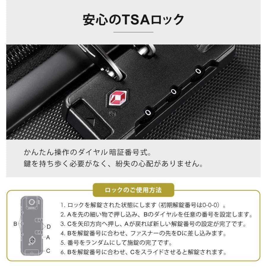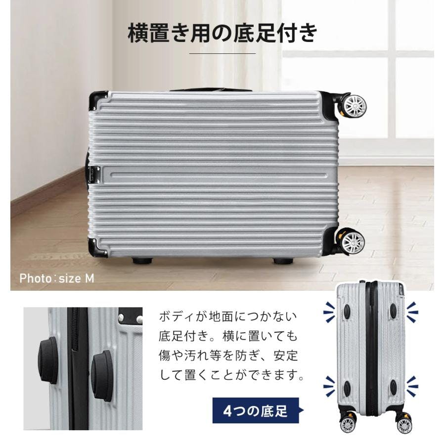 ■機内持ち込み適応サイズ※航空会社により規定が異なりますので、ご利用の際の詳細は航空会社へお問合せ下さい。■どんな服装にも合わせやすく、高級感のあるボディデザイン。■ストッパーがあれば電車内や坂道で立ち止まる時、手で支えなくてもスーツケースが転がらないので安心です。■海外旅行でも安心・安全。かんたん操作のダイヤル暗証番号式。■360°回転できるダブルキャスターは、安定感があるのでなめらかな移動と静音性に優れています。