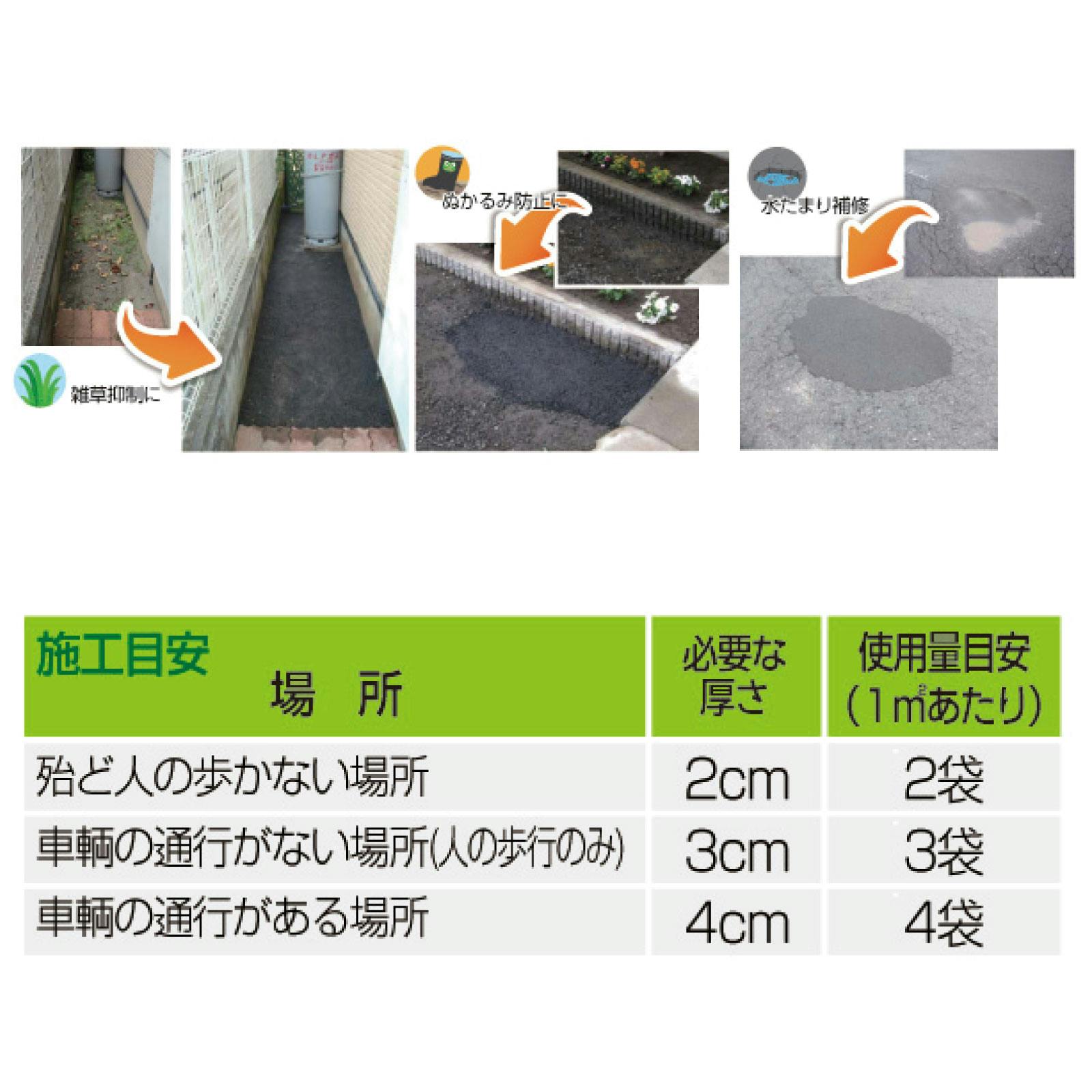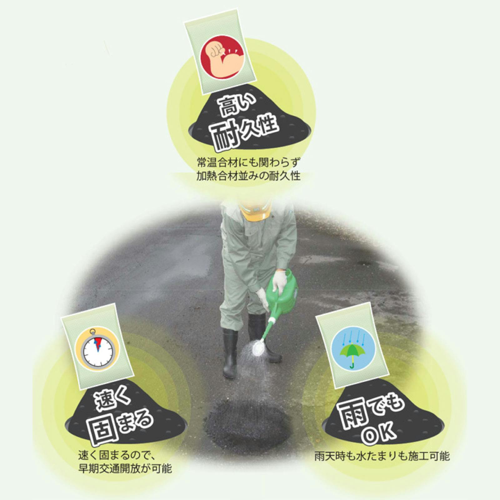植物由来の原料の使用しているため、人と環境に優しい製品です。 ●化学反応タイプの常温アスファルト混合物です。●従来の常温アスファルト混合物(揮発硬化タイプ)と比べて耐久性が非常に高く、速く固まります。●雨天時および水たまり箇所での施工にも適用できます。●1袋20kg入りで販売しています。製造日から6ヶ月程度の保存が可能です。●1平米施工するのに必要な量は、施工厚さ4cmの場合5袋程度です。