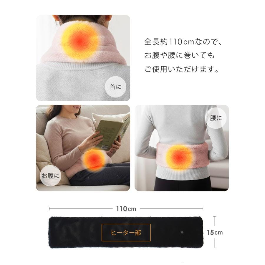■DC入力 5V■製品サイズ(約) W110×D15cm■重量(約) 240g■連続使用時間 3時間(自動OFF)■材質 ポリエステル100%■温度調節 低温:約30℃/中温:約40℃/高温:約50℃消費電力 4.75W