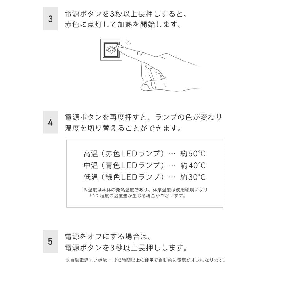 設定温度は3段階に調節が可能。色ごとに分かりやすく、簡単に操作ができます。