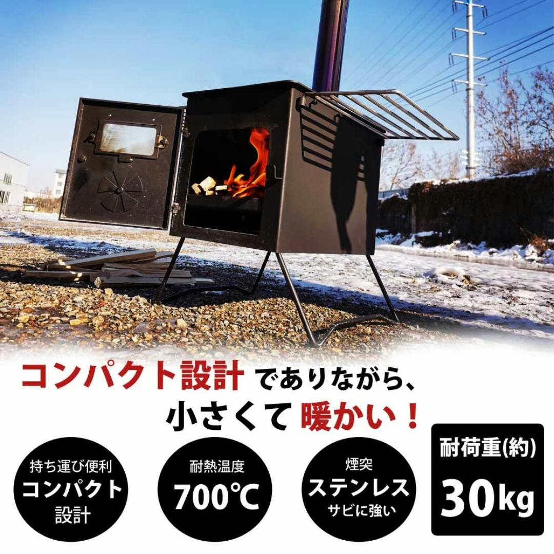 ■野外での暖房器具としてはもちろん、天板の熱を利用して湯沸かしや、加熱調理にも使用できます。キャンプやアウトドアにはもちろん、災害時など、もしもの時の備えにもなります。■ソロキャンプや初めてのアウトドアでも扱いやすい、収納・持ち運びが可能なコンパクトサイズ。スペースを取らず、手軽に設置して使用できます。■耐熱ガラス付きで暖炉のように炎を眺める事ができます。■本体の両サイドにグリッドが付きます。物や調味料など、載せるのに便利です。暖房&調理器具、1台2役で大活躍できます。