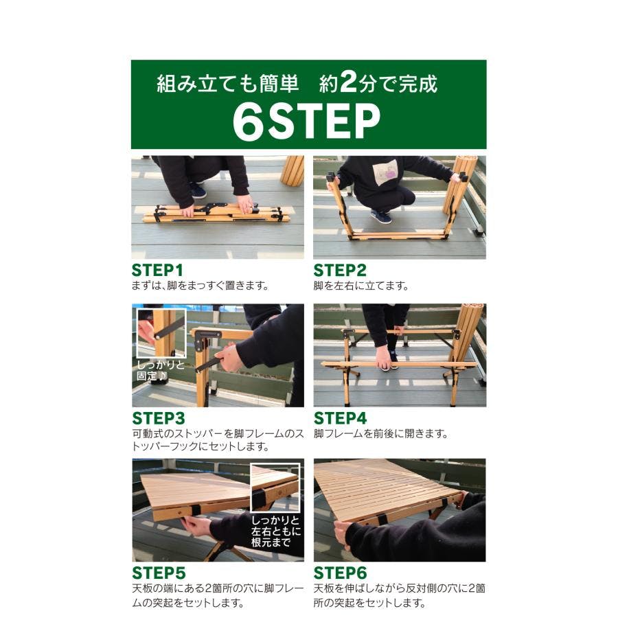 組み立てもとっても簡単!秘密は2つにばらせるロール式の天板と組み立て式のフレームにあります。女性でもらくらく2分ほどで組み立てができます(組み立て画像参照)。コンパクトに収納できるのも魅力。付属の収納バッグに入れて簡単に持ち運ぶことができます。