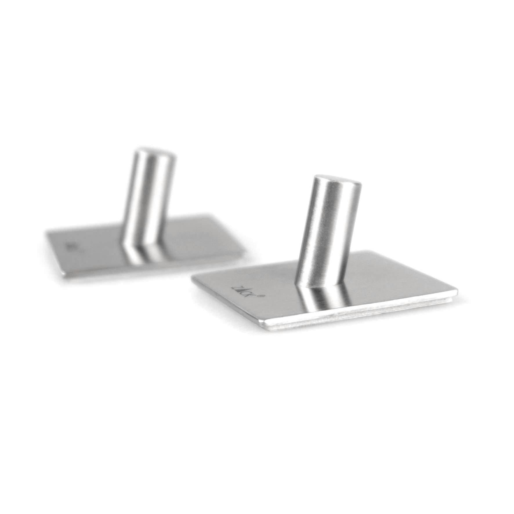 マットなヘアライン仕上げのシングルフック2個入。簡単に壁面に接着できます。キッチン回りのループタオルや、シンク回りのバスタオルに限らず、帽子やハンガーフックなどにもお使いいただけ、手軽なのに用途が広いのも特徴のひとつです。裏面には接着シールがついており、ガラス面や穿穴できないタイル面などへ取り付けたいシーンで重宝します。