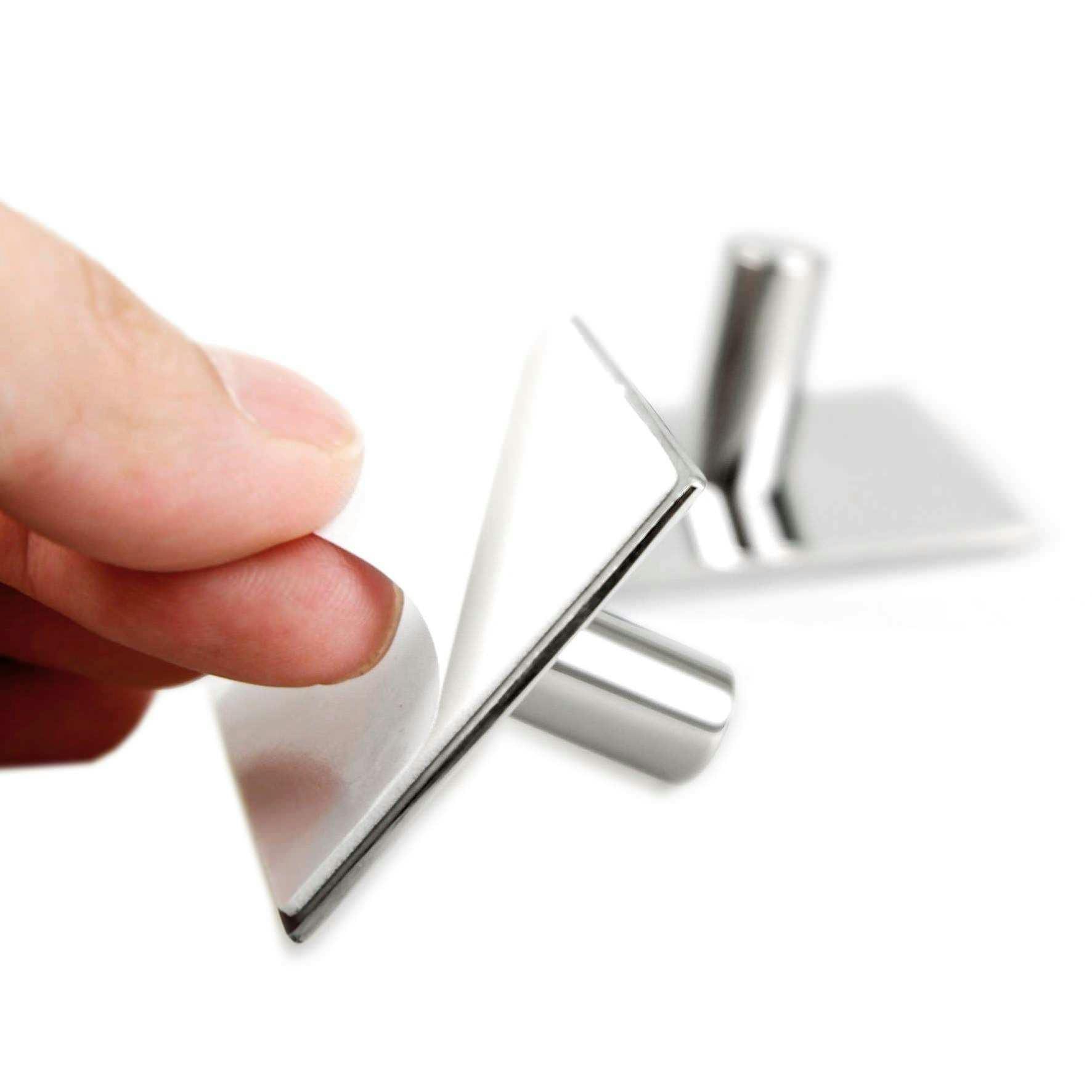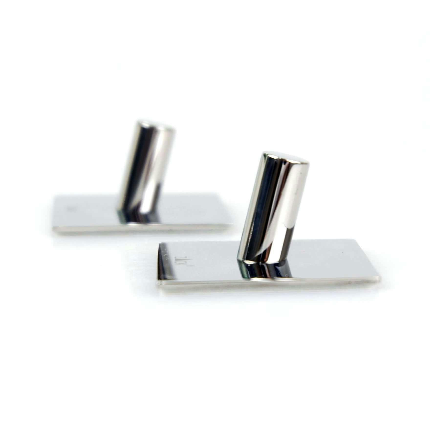 つやのあるミラーポリッシュ仕上げのスクエアタイプのシングルフック2個入。簡単に壁面に接着できます。キッチン回りのループタオルや、シンク回りのバスタオルに限らず、帽子やハンガーフックなどにもお使いいただけ、手軽なのに用途が広いのも特徴のひとつです。裏面には接着シールがついており、ガラス面や穿穴できないタイル面などへ取り付けたいシーンで重宝します。