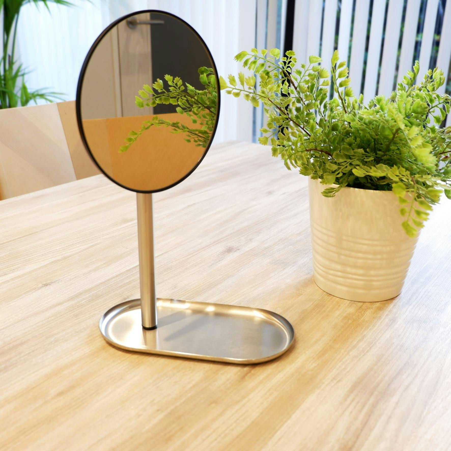 トレー付きハンドヘルドミラー(等倍/片面鏡)です。ミラーは取り外しが簡単にでき、ホルダーにさしたまま360度回転します。化粧品やアクセサリー等が置けるトレー付き。他にもマットブラック仕上げのミラーもございますので、お好みに合わせてお選び下さい。