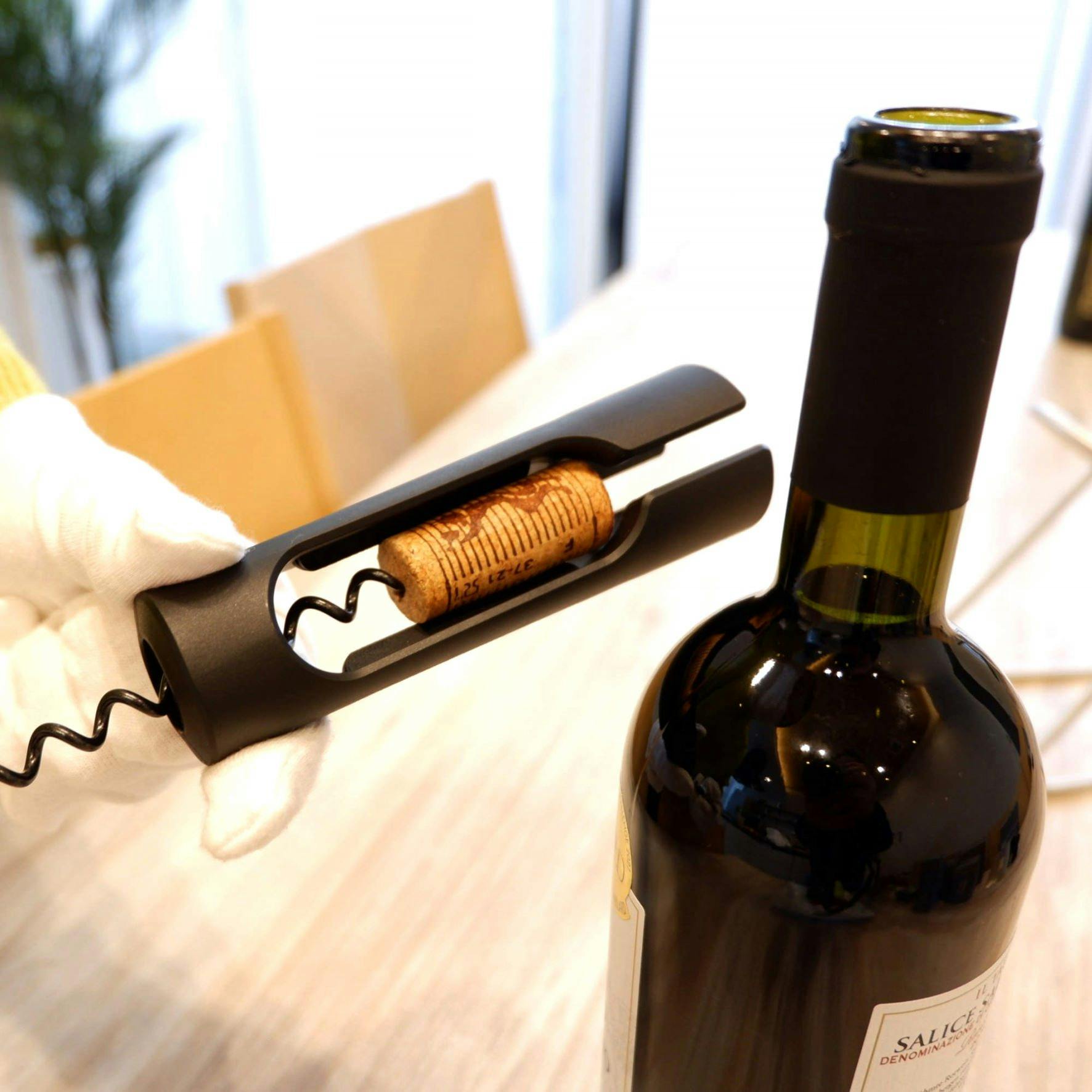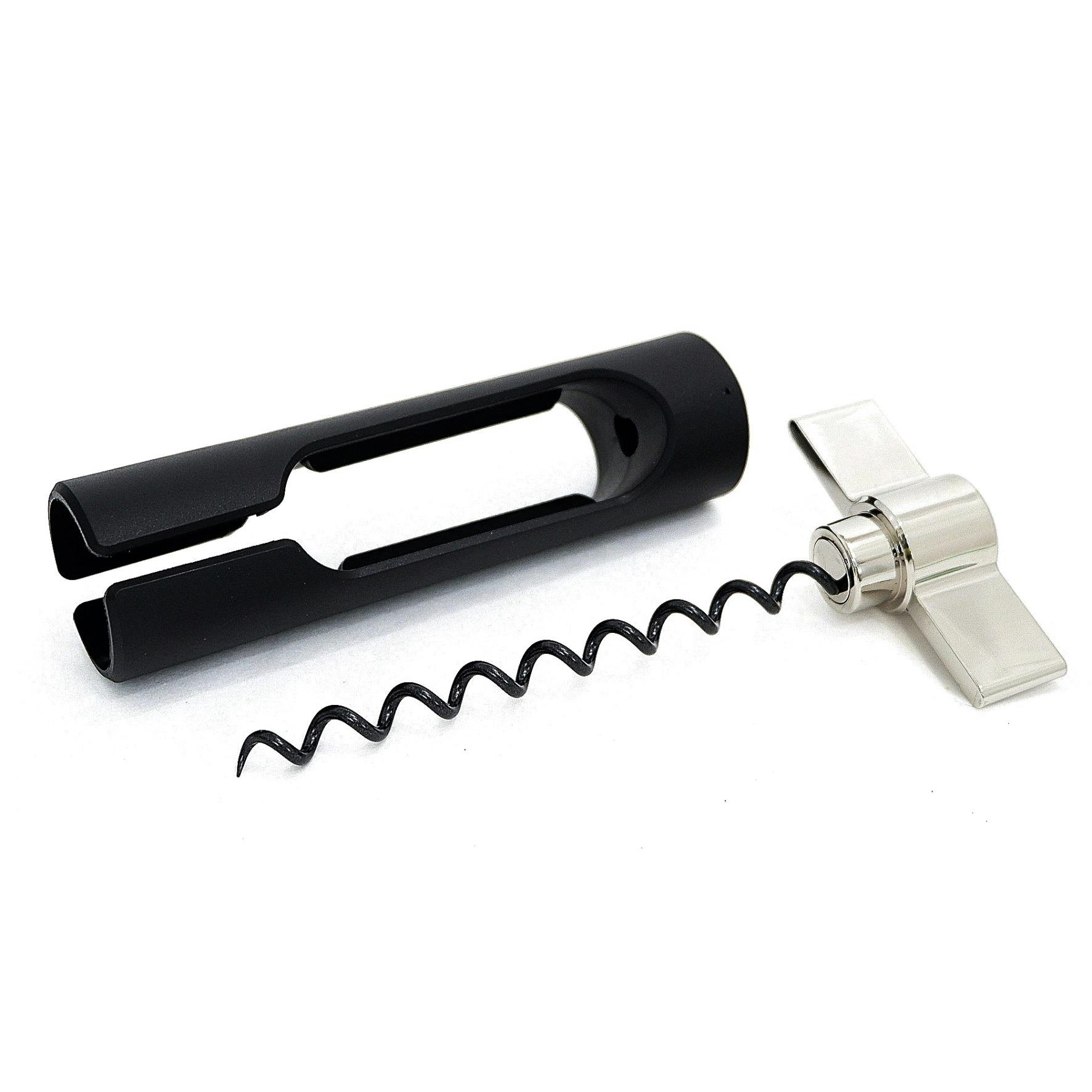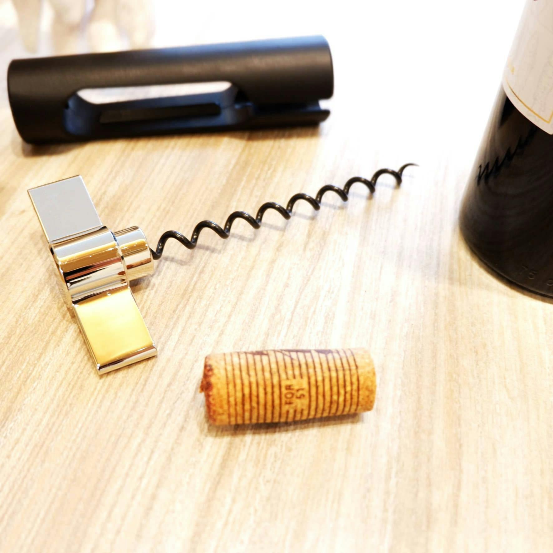 支えとなる本体は、シックなブラックのABSを使用しているため、日常的にお使いいただくにはとても軽量で使いやすいコークスクリューです。ハンドル部分はニッケルでメッキされているので、軽量でありつつ、メタルテイストの高級感があります。スピンドルには、コルクに簡単にねじ込むためのテフロンコーティングが施されており、わずかな力で簡単にコルクを抜くことができます。