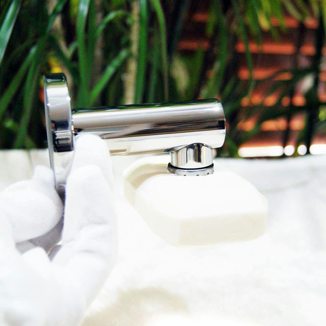 マグネット付きソープホルダーです。手持ちのソープに金具を差して、壁に取り付けるバーの先端がマグネットで着脱出来る、とてもユニークなアイディアグッズ。ソープトレイですと、どうしても石鹸カスや水垢、水はけなどが気になりますが、こちらなら衛生的かつお手入れも金具から外すだけなのでとても楽で便利です。また、壁付けタイプなので、パブリックなスペースにも最適ですし、キッチン回りにあっても重宝します。