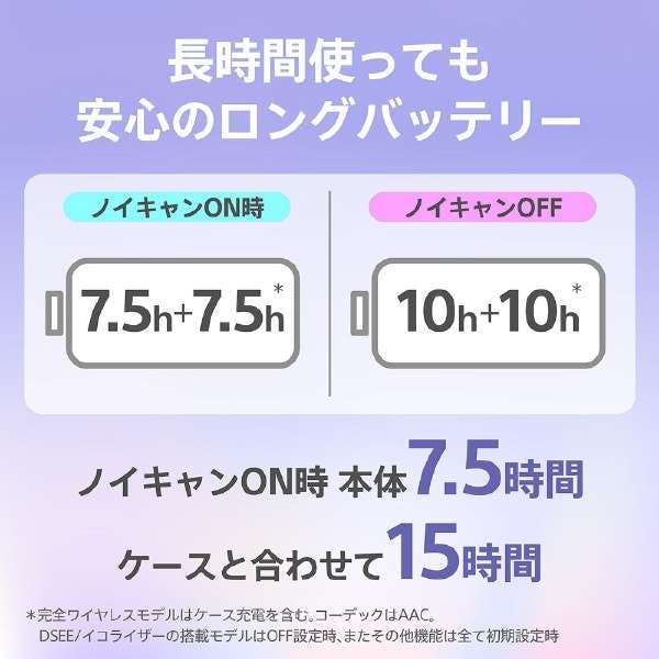 ・形式:密閉ダイナミック型・本体質量:約 4.6 g x 2 (イヤーピース(M)含む)・連続再生時間(イヤホン+ケース):最大20時間(10時間+10時間)・充電時間(ケース使用):約1.5時間(USB充電)・通信方式:Bluetooth標準規格 Ver.5.2・主な付属品:ハイブリットイヤーピース(SS、M、LL 各2)、充電ケース、USB Type-C(R)ケーブル(USB-A - USB-C(R))(約20 cm)、保証書
