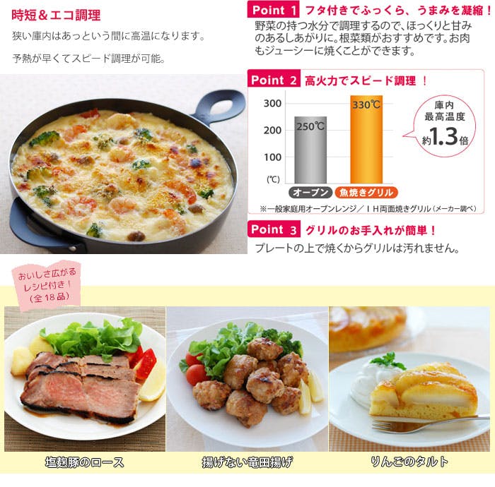 短時間で高温になる魚焼きグリルを使って、おうちで手軽にダッチオーブン料理が楽しめます。 一般的な鉄鋳物製のダッチオーブンに比べて軽く、家庭でも手軽に楽しめる扱いやすい形。コンロで焼いてそのままグリルに入れられます。 補助ハンドル付きで持ちやすく、できたてアツアツをそのまま食卓へ。