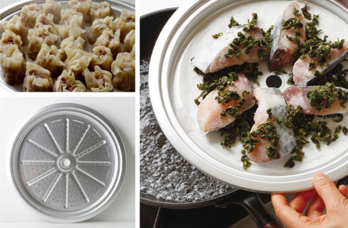 本体:アルミニウム合金(AC7A) 内面:テフロンTMプラチナプラス加工、外面:セラミック耐熱塗装 底面:鉄・アルミニウム溶射 はり底蓋/トレー:アルミニウム合金(アルマイト加工) スチームコントローラー:フェノール樹脂 取っ手:天然木