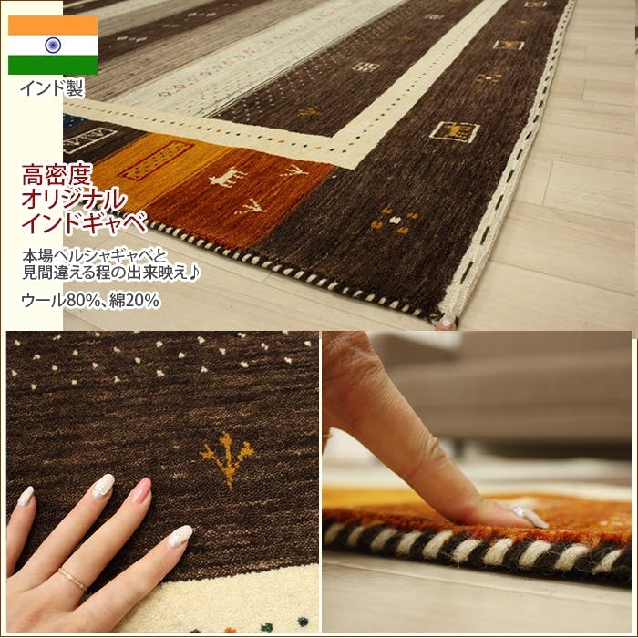 天然素材のウールを使用し、しっかりと織り込まれたインド製ギャベ。素朴で暖かみのあるデザインが可愛いらしい1枚です♪毛の向きによって色合いが違って見えますが、それが自然でナチュラルな風合いを演出します。
