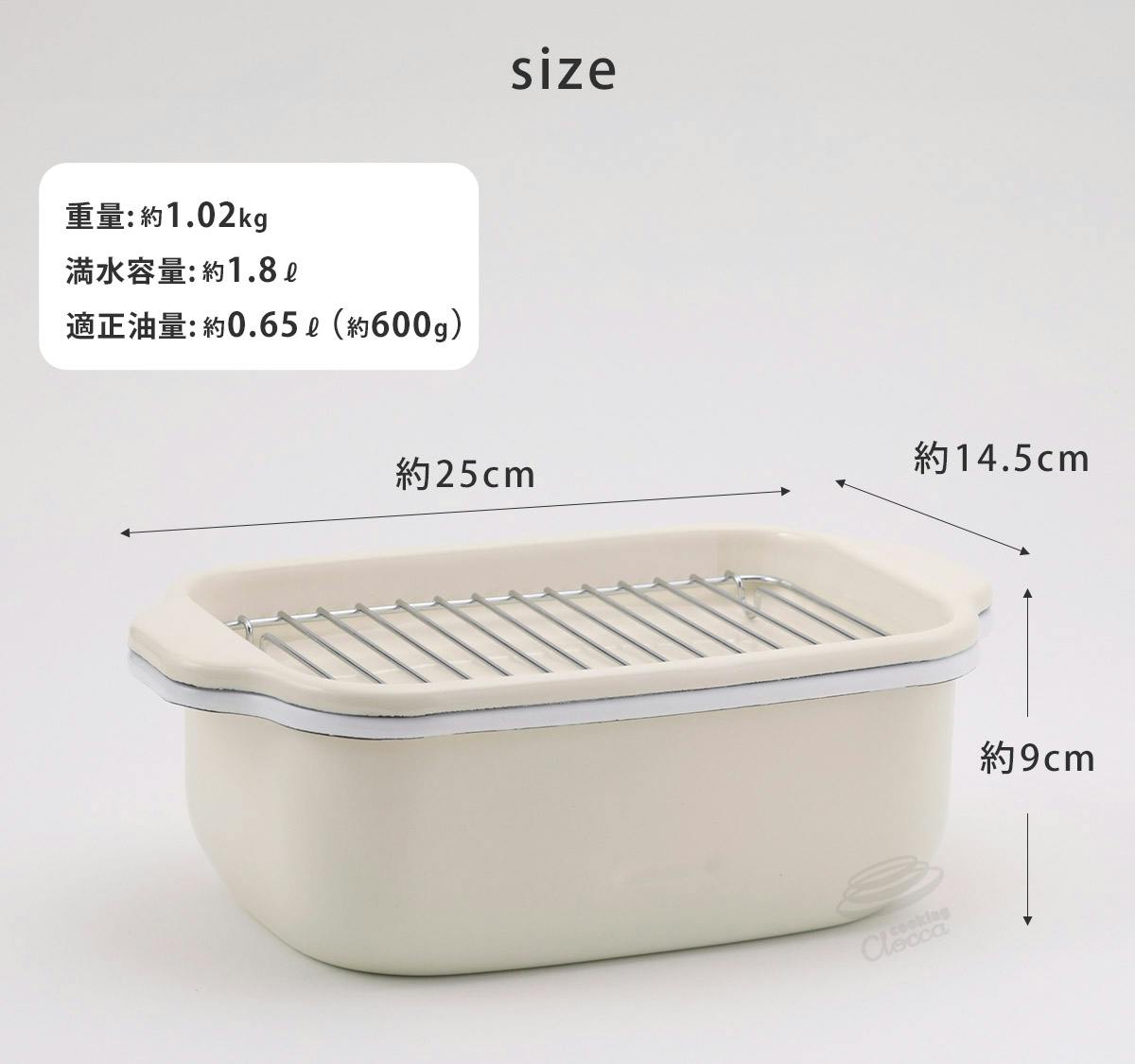 少ない油で揚げ物に十分な深さを確保したスリムな角型の揚げ鍋です。 海老天、アスパラガス、ロースかつなど長めの食材も調理しやすい横長設計です。 琺瑯素材は熱効率が良く、揚げ物がカラッと仕上がります。