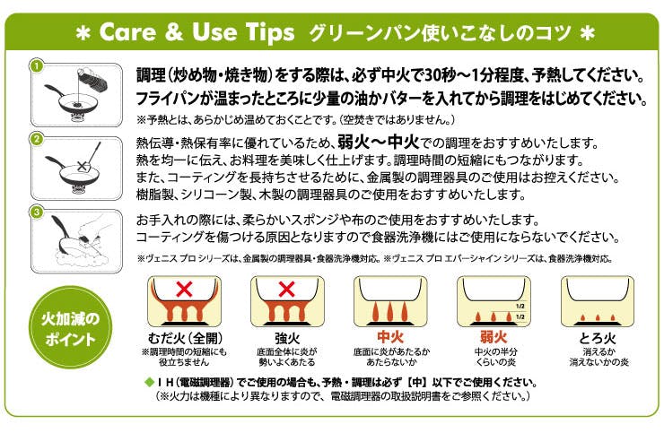 ○調理(炒め物・焼き物)をする際は、必ず中火で30 秒~1分程度、予熱してください。鍋が温まったところに少量の油かバターを入れてから調理をはじめてください。 ○熱伝導・熱保有率に優れているため、弱火~中火での調理をおすすめいたします。 ○コーティングを長持ちさせるために、金属製の調理器具のご使用はお控えください。 ○お手入れの際には、柔らかいスポンジや布のご使用をおすすめいたします。コーティングを傷つける原因となりますので食器洗浄機にはご使用にならないでください。