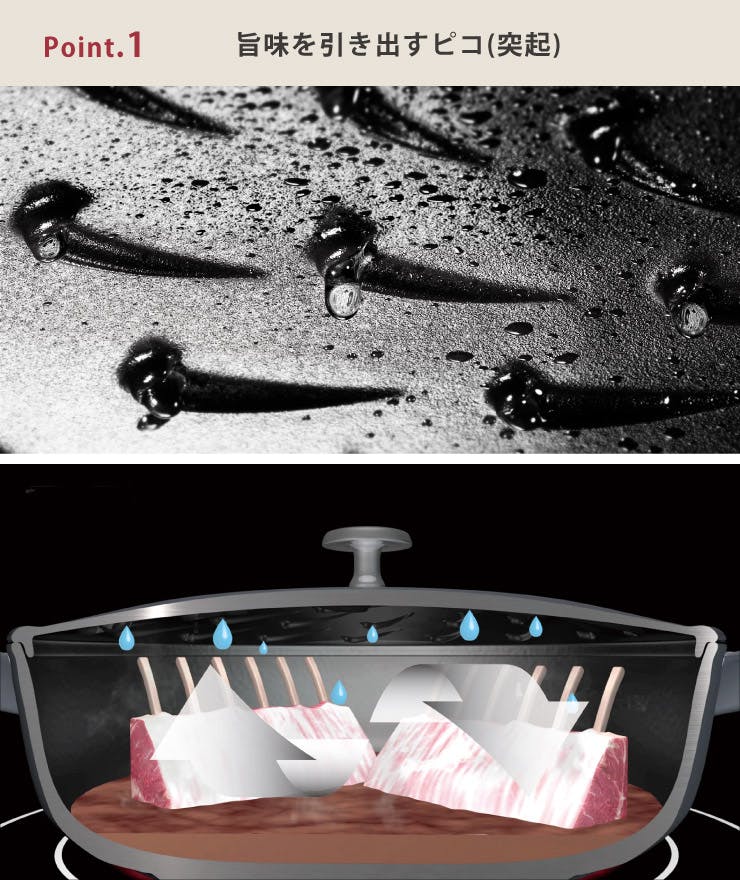 本体:鋳鉄 内面:黒マットエマイユ(ホウロウ)加工 外面:エマイユ(ホウロウ)加工 フタつまみ:真鍮