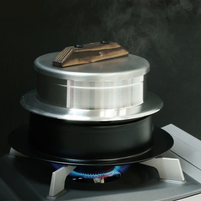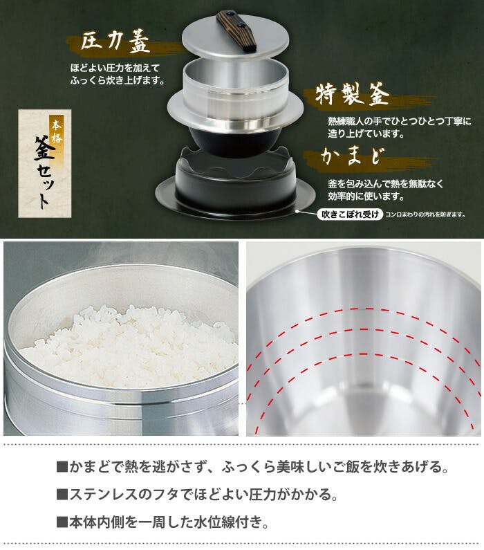 本体:アルミニウム合金(板厚3.0mm) 本体内面:研磨仕上げ 本体外面:旋盤加工、つば下:耐熱焼付け塗装 蓋:ステンレス鋼(板厚3.0mm)/つまみ:焼杉 かまど:アルミ板(板厚1.2mm)、耐熱焼付け塗装