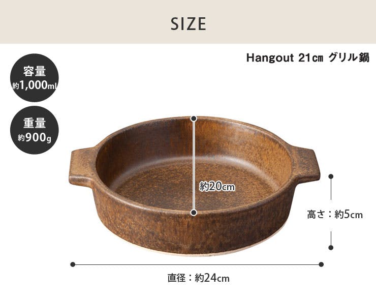 「作る&食べるをもっと楽しむ」 キッチンとアウトドアの境目を無くし、もっと自由に料理を作ること食べることを楽しみたいそんな願いから生まれたhangoutシリーズ。 信楽焼ならではの素朴な土の風合いを活かした雰囲気のあるグリルココット。