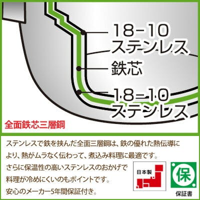 「本体」全面三層鋼(厚さ1.0mm)、「フタ」18-8ステンレス、「ハンドル・つまみ」フェノール樹脂