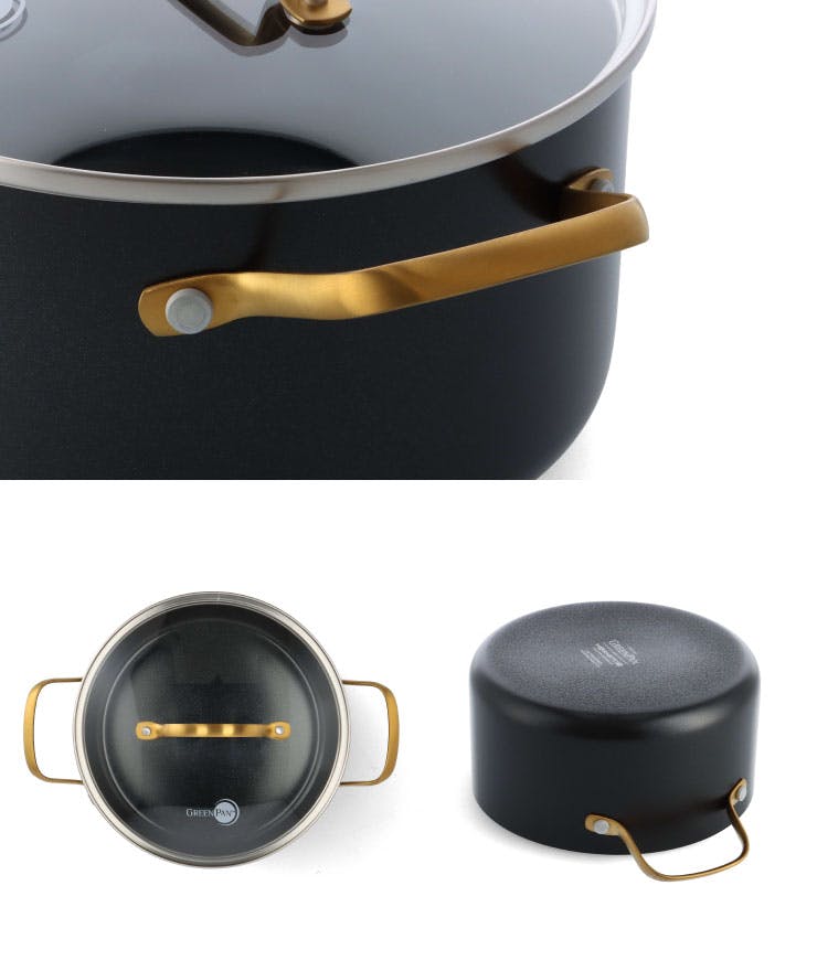 新シリーズ「STUDIO(ストゥディオ)」は、クールなブラックのボディとゴールドハンドルを組み合わせた洗練したデザインのコレクション。 他には見ないグリーンパンらしいデザインです。