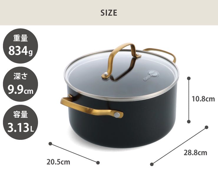 本体:アルミニウム合金 表面加工(内面、外面):セラミックコーティング ハンドル:ステンレス鋼 蓋:強化ガラス(全面物理強化)、ステンレス鋼