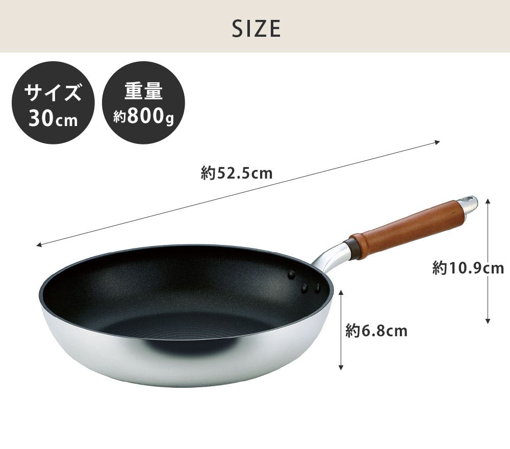 本体:アルミニウム合金(マグネシウム合金) 内面:テフロン(TM)プラチナプラス加工、リップルウェーブ加工 外面:ミラー仕上げ 底面:サテン仕上げ 取っ手:天然木