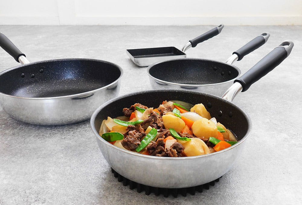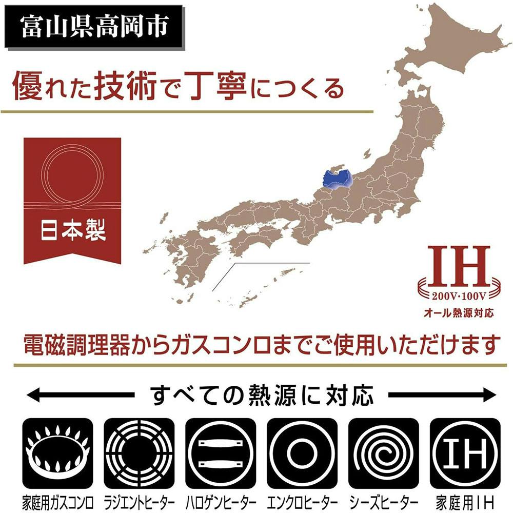 本体:アルミニウム合金 内面:ふっ素樹脂加工(ダイキン Silkware SD) 外面:ミラー仕上げ 底面:ステンレス板圧着 取っ手:フェノール樹脂