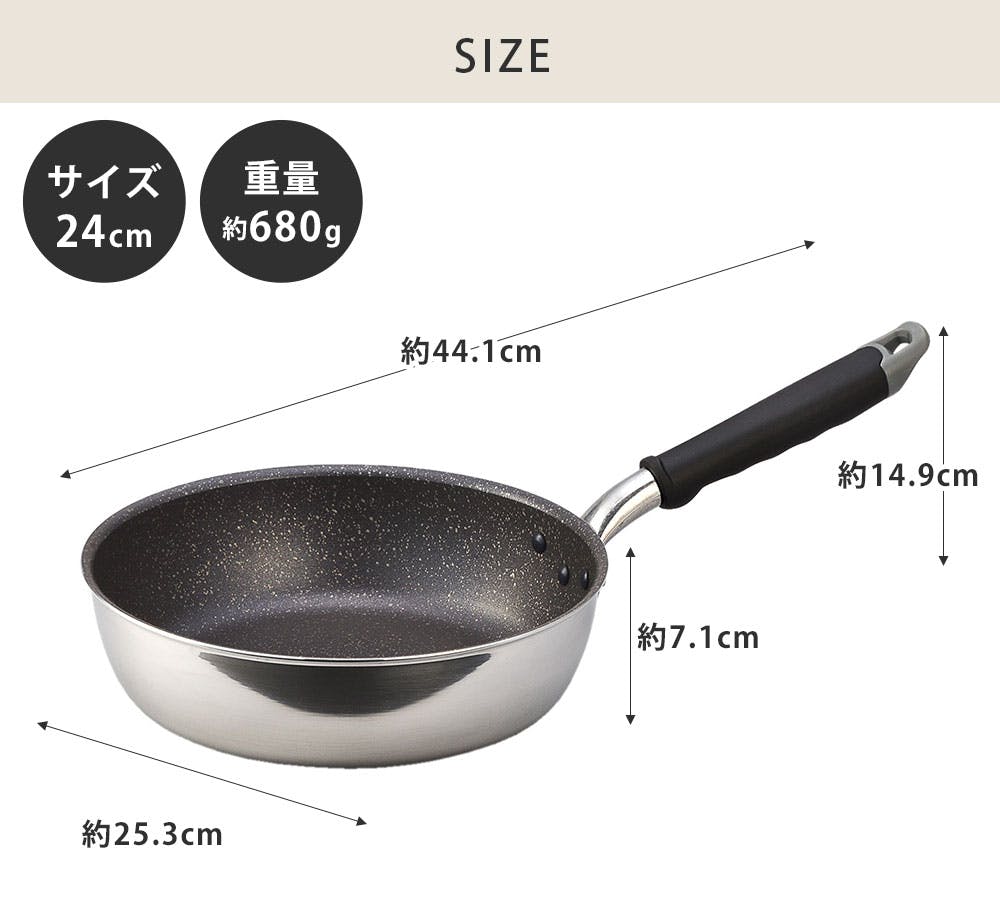 本体:アルミニウム合金 内面:ふっ素樹脂加工(ダイキン Silkware SD) 外面:ミラー仕上げ 底面:ステンレス板圧着 取っ手:フェノール樹脂