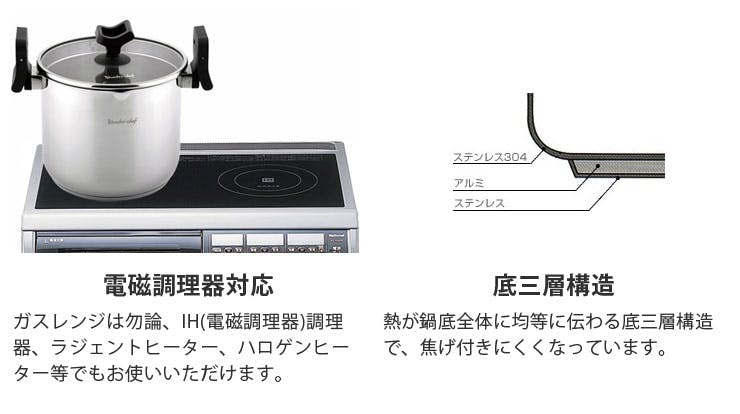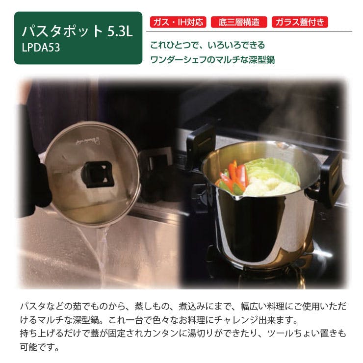ワンダーシェフ パスタポット 5.3L 蒸しす付き IH対応 Wonder chef LPDA53【両手鍋 IH ステンレス パスタパン 深鍋 スチーマー すのこ】