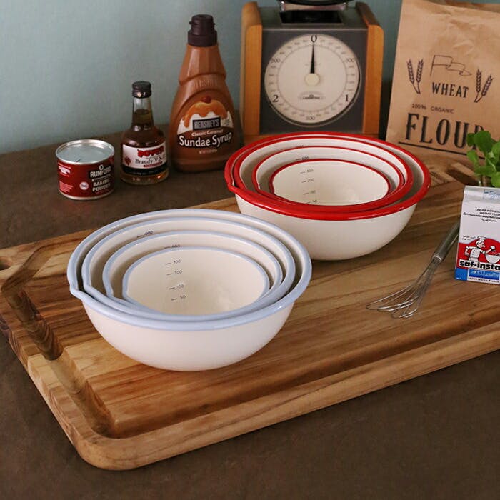 カラーはホワイト/レッドの2種類、サイズは12cm/15cm/18cm/20cmの4種類からお選びいただけます。重ねて収納することができます。