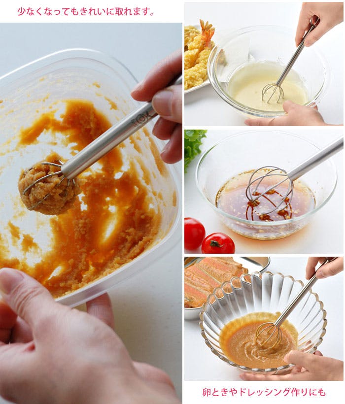 「いつもの味が手軽に作れる」計量みそマドラー。 お味噌に差して、くるっと回すとお味噌をカンタンに計量でき、そのままお鍋で溶かせます。 毎日のお味噌汁をカンタンに一定の味付けで作ることができるので、塩分の取りすぎも防げます。