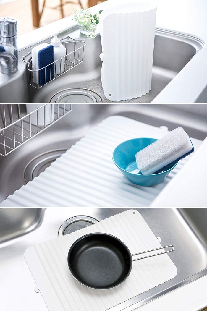 進化するキッチンに合わせて使いやすさを実現! 技ありアイテムでシンクまわりがグンと使いやすくなります。 立てて乾かせるシリコーンシンクマット Sは、波型が熱やキズからシンクを守ります。 使った後は、立たせて乾燥させることが可能です。