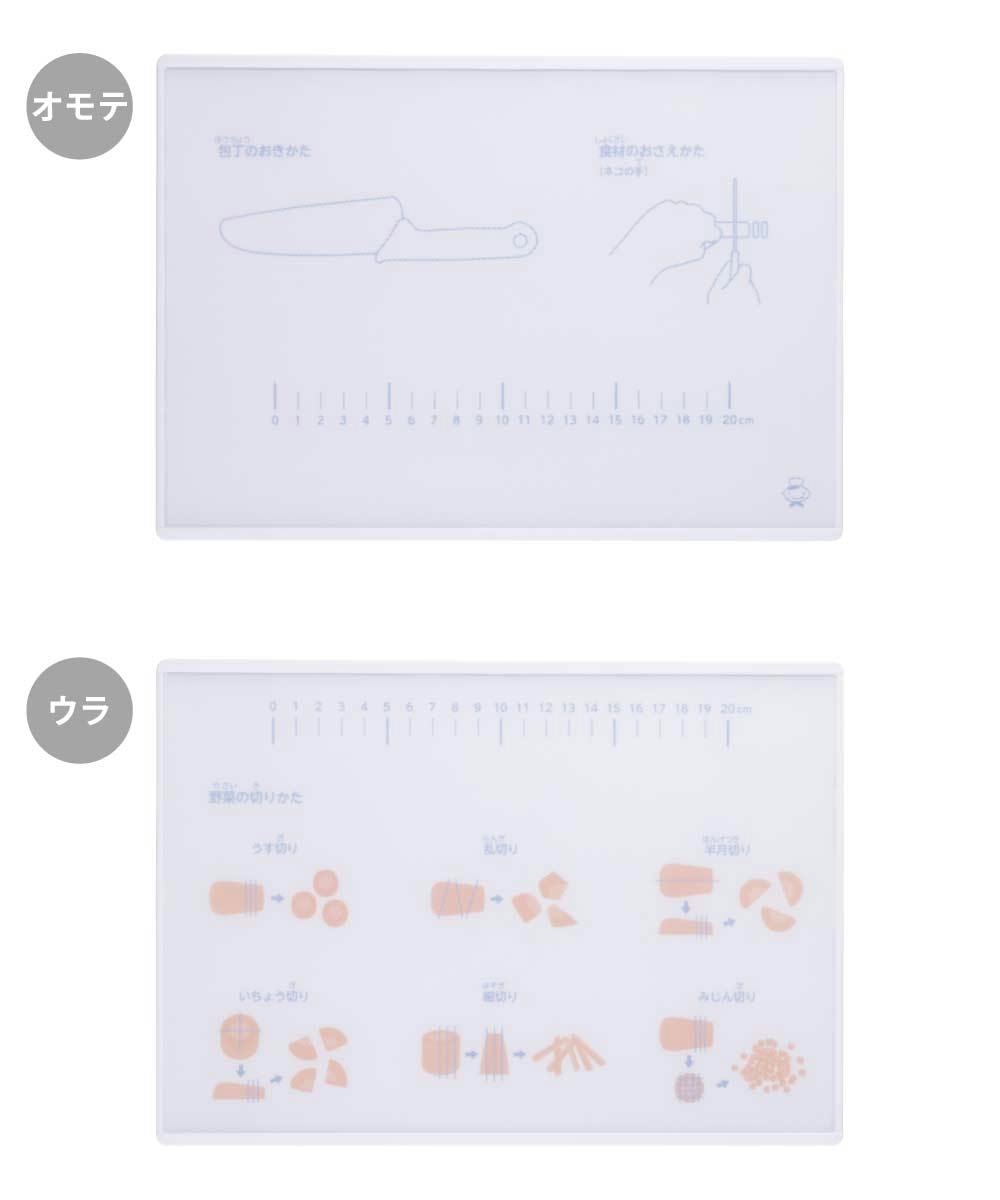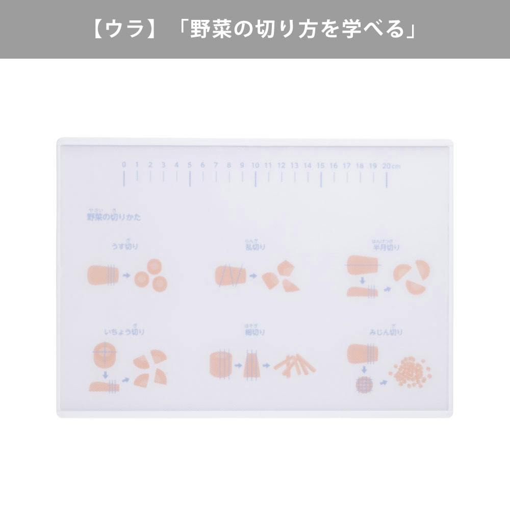 両面が使えて異なるデザインのまな板です。 まな板に包丁のつかい方や野菜の切り方がデザインされているので、調理をしながら学ぶことができます。 食洗機可能なので、お手入れ簡単です。