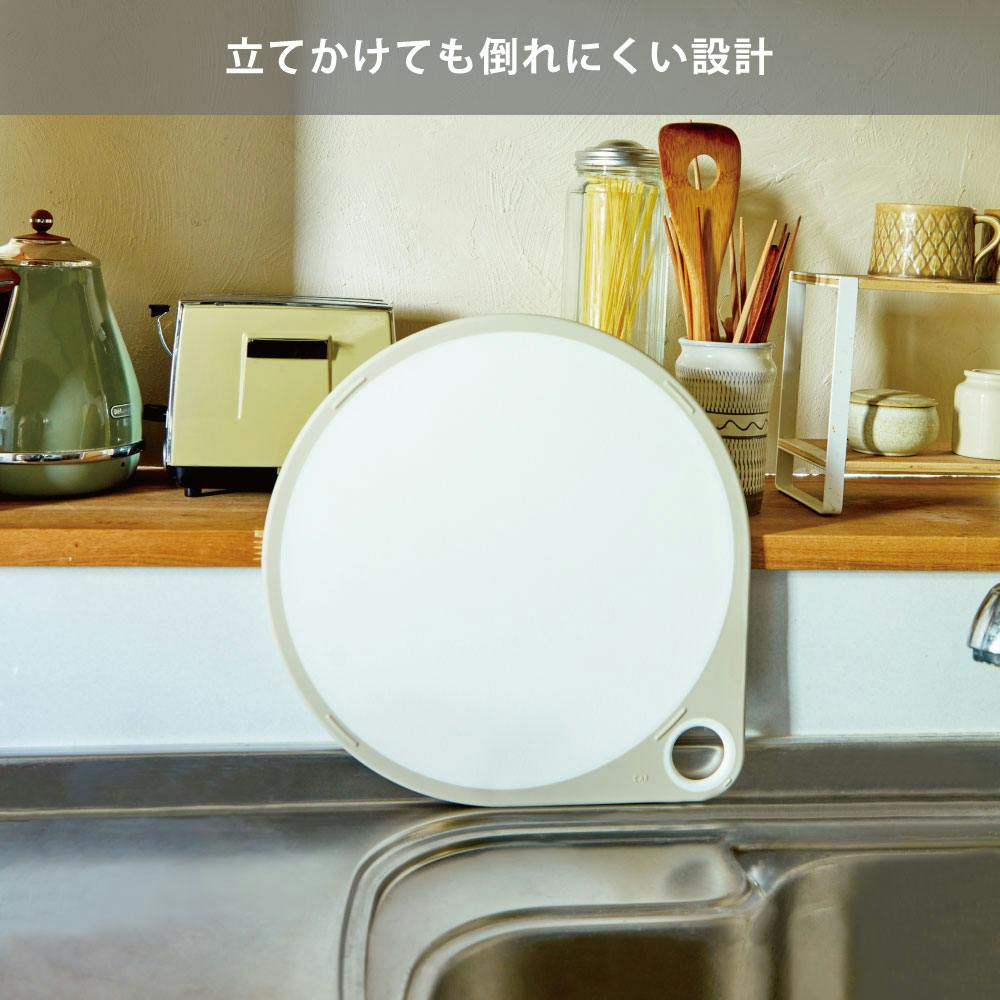 奥行きたっぷり、ひろく使えるまるいまな板。 複数の食材の下ごしらえも、まな板上で行うことができ、洗い物も軽減できます。 また直線部分を設けることで転がりにくく倒れにくい、立てかけ収納が可能な形状になっています。