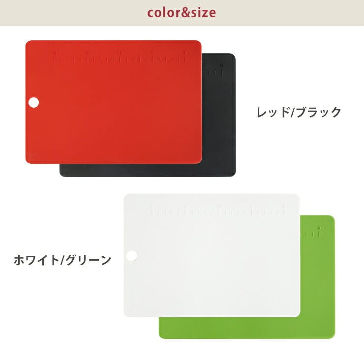 抗菌剤練りこみシリコーンを使用。 一体成型で清潔に保てる抗菌キッチンツール。 表裏で色が違うので食材によって使用面を使い分けられます。 目盛りがついているので切る際の目安になります。