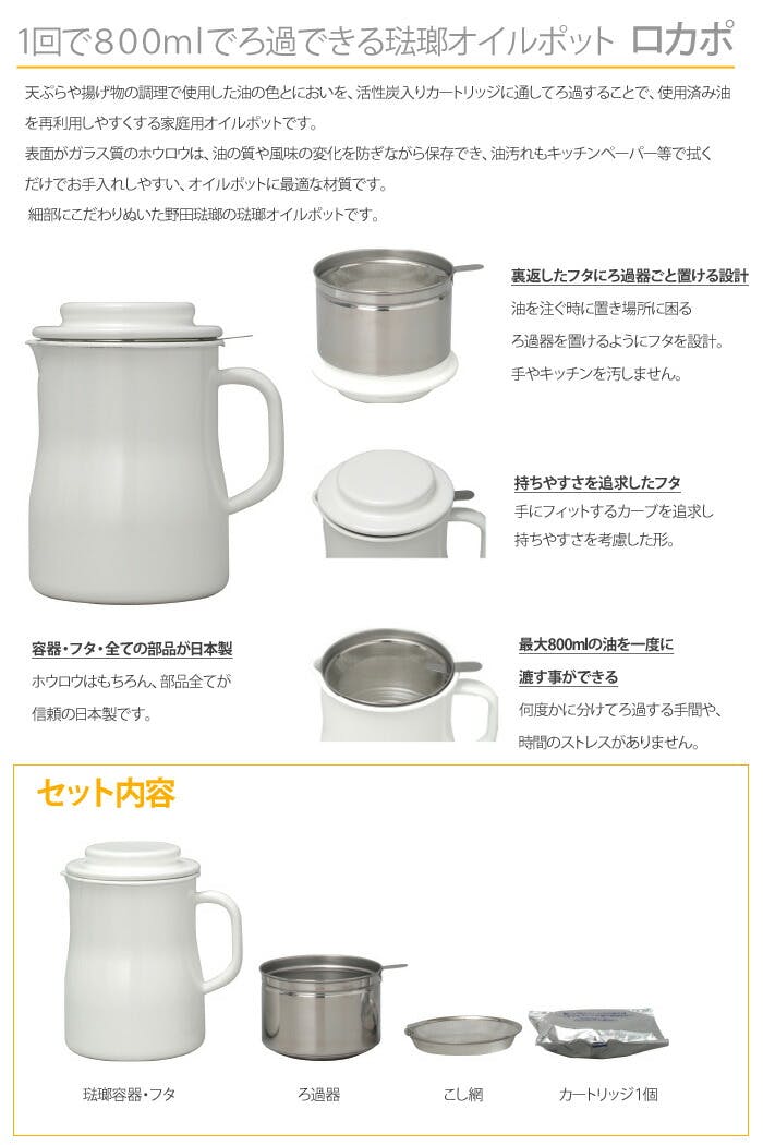 野田琺瑯 オイルポット ロカポ 活性炭カートリッジ付き ホワイト NOL-800【油ポット ホーロー 琺瑯 ほうろう ろ過 濾過 油こし 油こし器 活性炭フィルター 日本製】