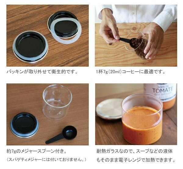 耐熱ガラス製のキャニスターは、コーヒー・紅茶はもちろん、乾物や液体の保存に最適。シリコンパッキン付きで密閉性に優れています。 本体は、家庭用食器用洗浄機、電子レンジ使用可能。スープなどの液体もフタを外せば、電子レンジで加熱できます。 1杯7g(約20ml)でコーヒーの計量に最適なポリプロピレン製のスプーン付き。 蓋のパッキンは取り外せて洗えるので衛生的です。
