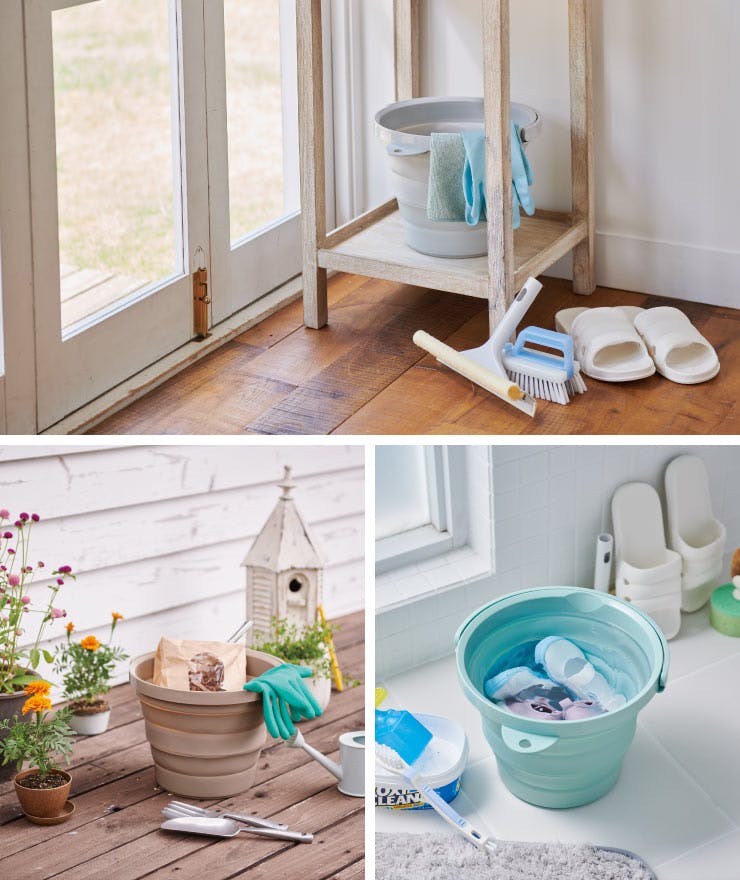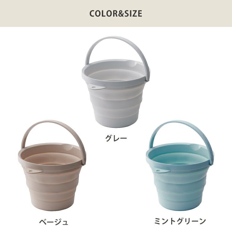 やわらか素材の折りたたみ式ソフトバケツ。 ランドリーやお掃除道具入れに。つけおき洗いやスニーカー洗いに。レジャーシーンでも活躍します。 防災用品として常備しておいても役立ちます。 使用後はたたんでコンパクトに収納できます。引っ掛けて収納できるフック穴付き。
