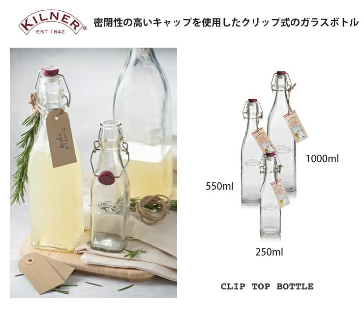 密閉性の高いキャップを使用したクリップ式のガラスボトルです。何度でも繰り返してお使いいただけます。 しっかりとロックできるクリップ式で、圧力がかかりすぎずに充分な気密性が保てるように研究を重ねて作られています。 パッキン付きのキャップとロックでしっかりと中身をガードします。クリップには耐久性のあるステンレススチールを使用しています。 使用する量を調節しやすい、ワインボトルのような口の作りです。