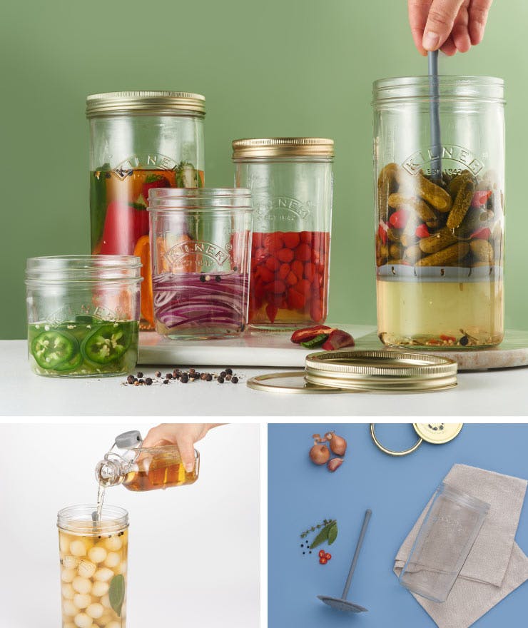 シリコーン製リフターを上に引っ張るだけで液体から食材だけを分離でき、手早く簡単にピクルスを取り出すことができます。 玉ねぎ、ビーツ、キュウリ、カリフラワーなど、様々な食材にピッタリです。 ソーダガラス製の本体には便利な容量表記入りです。(表記容量:250ml/500ml/750ml/1000ml) 密閉性の高い二重フタ式。圧力がかかりすぎずに充分な気密性が保てます。