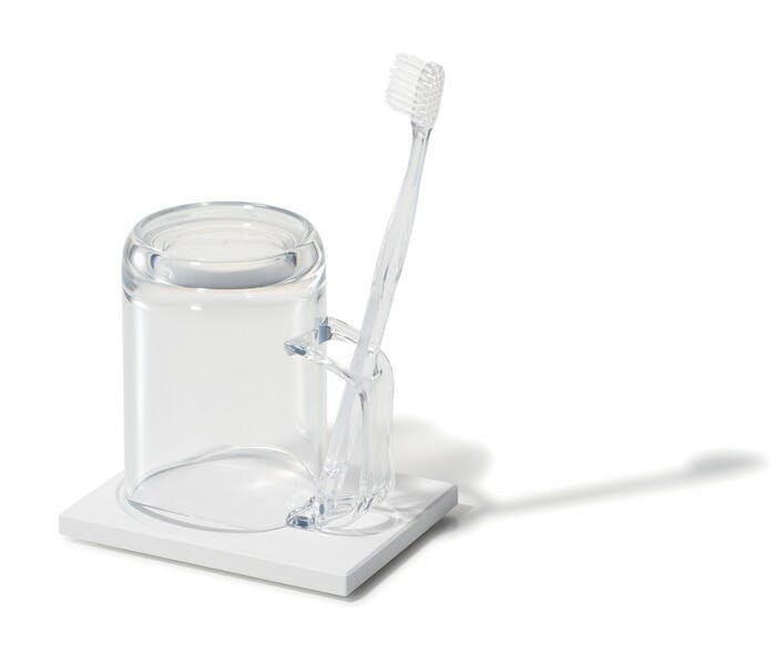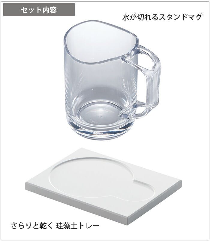 ひっくり返して水が切れる、歯ブラシスタンド付きのマグと濡れたものがさらりと乾く珪藻土トレーのセットです。 歯ブラシは付属しません。