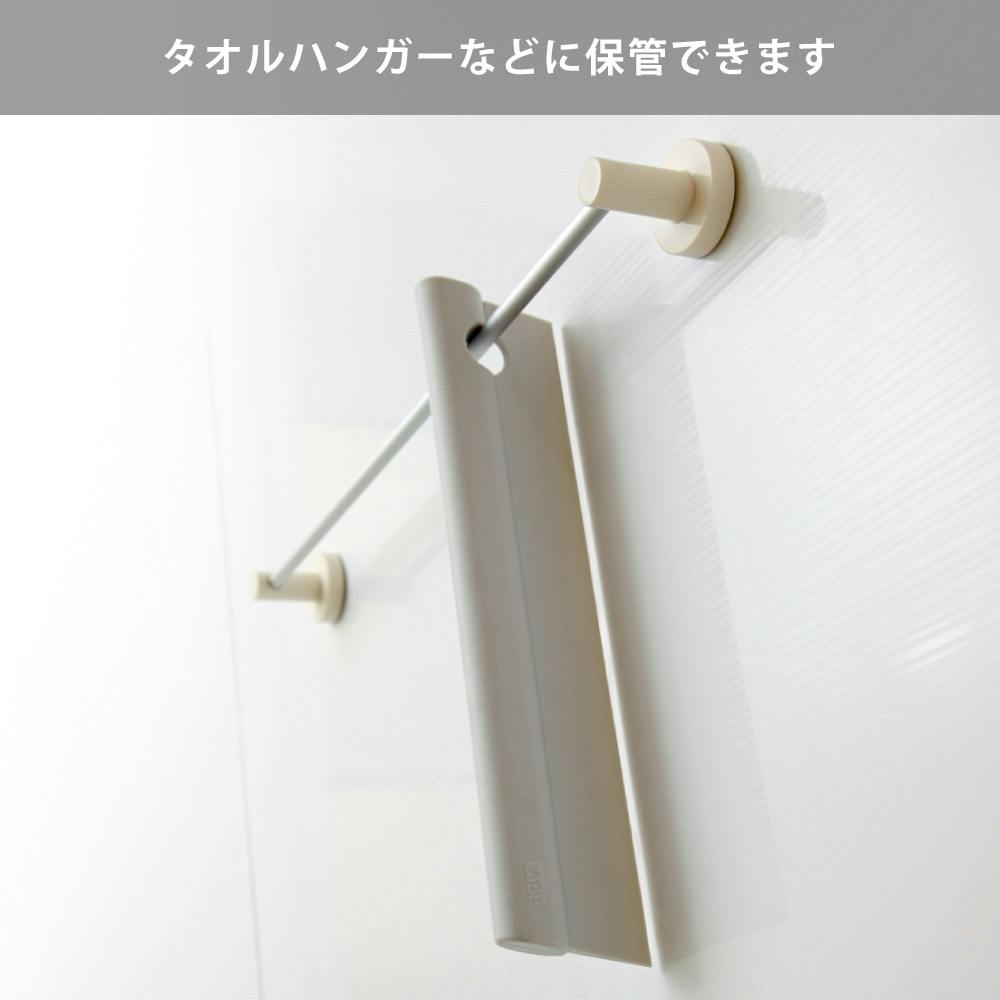 スキージーはバスルームの壁・鏡などの水切りに便利なスクイ-ジーです。 バスルームの壁面など、広範囲の水滴を取ることができます。 お風呂上りにサッと使えば、水あか、カビの発生を抑えられます。 タオルハンガーや蛇口に掛けて保管できるので場所をとりません。