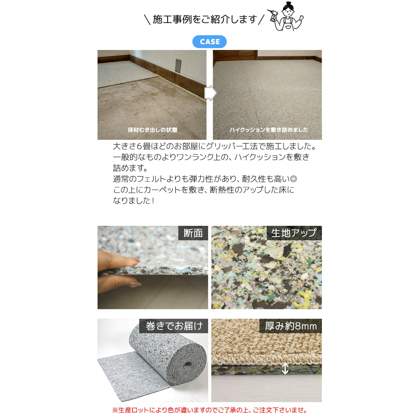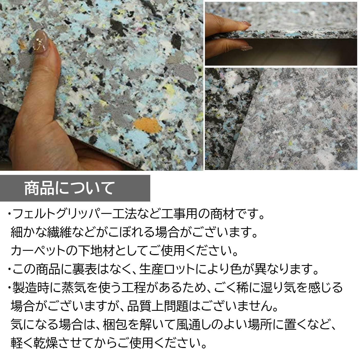 ・床衝撃音を吸収し、音をやわらげます。・ソフトで底つき感のない適度なクッション性です。・密度の高い連続気泡で構成されていますのでへたりはきわめて少なく、ウレタンフォームのもつ優れた断熱性が足元の底冷え感を防ぎます。・バラツキ、片寄りがなく、施工時にほこりがでません。・上面は不織布ですので、カーペットの敷き込みが容易です。・防かび性 : かびの発生がなく、とても衛生的です。・エコマーク認定商品です。※この商品に裏表はありません。