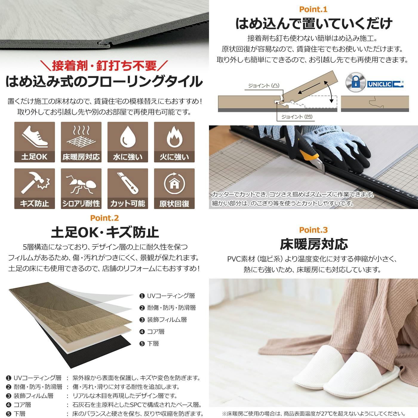 はめ込んで置くだけの施工で簡単に床のリフォームができるDIY向け床材です。釘や接着剤を使わずにセルフリフォームでき、取り外しも簡単なのでいつでも原状回復が可能です。カッターでカット可能なので、お部屋の形に合わせて施工できます。反りや伸縮に強いSPC素材で、水に強く、床暖房・土足にも対応。裏面にはクッションパッドが付いており、既存の床を傷つけることもありません。耐久性があり、土足使用、賃貸住宅、店舗などの床リフォームにもおすすめ!