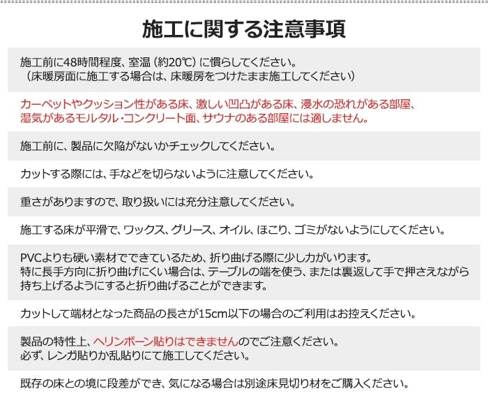 耐水、耐傷、耐衝撃性、耐火、防滑、シロアリ耐性、土足OK