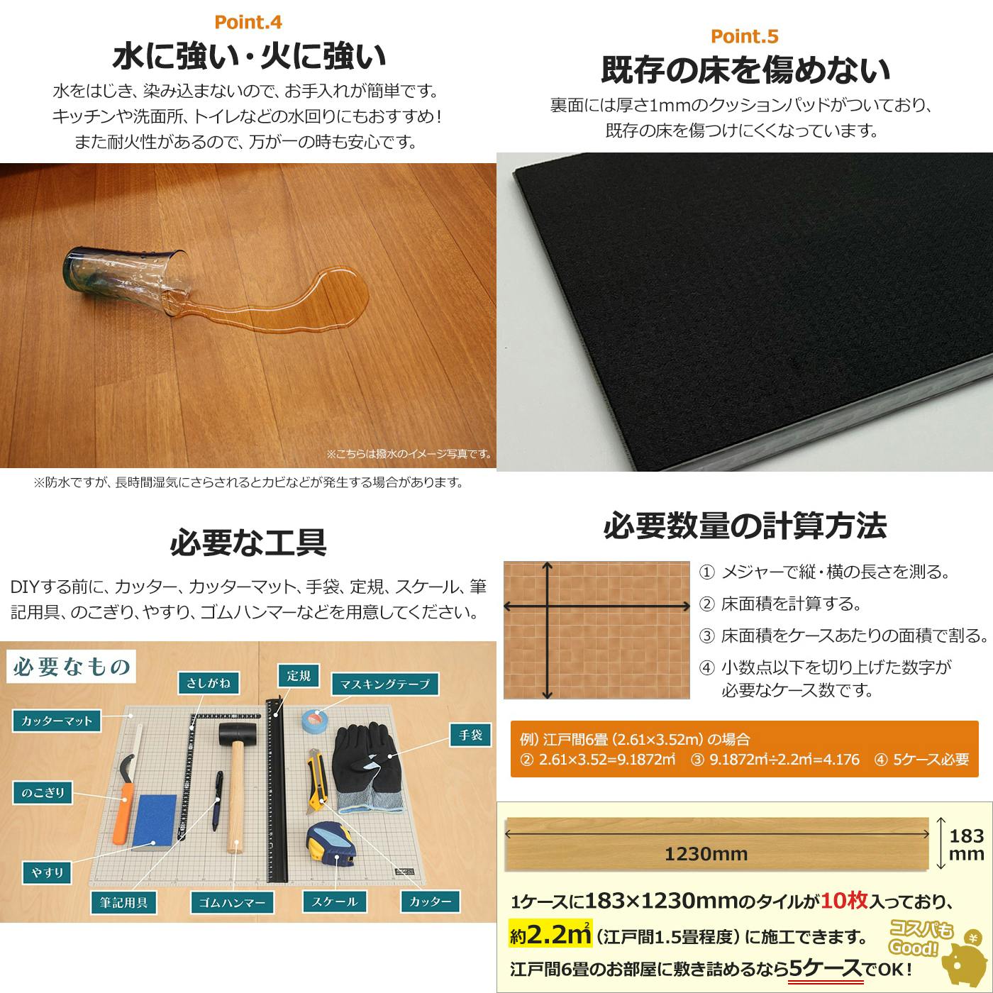 耐水、耐傷、耐衝撃性、耐火、防滑、シロアリ耐性、土足OK