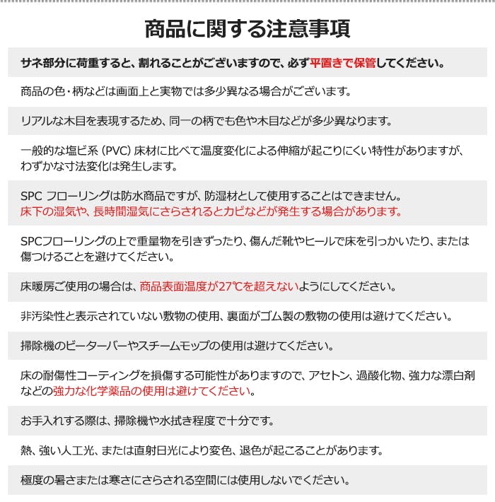 SPC(Stone Plastic Composite)、CaCO3、PVC、IXPE(照射架橋ポリエチレン発泡)※含有量は、石灰石パウダー(~80%)、PVCパウダー(~20%)で、天然資源の割合が高く、環境にやさしい製品です。