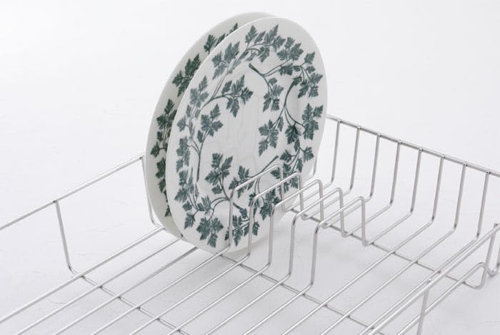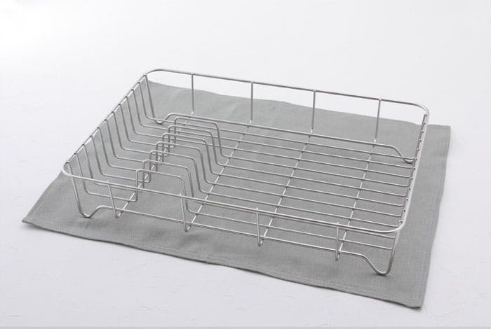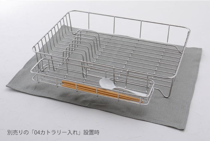 水に強くさびにくい18-8ステンレスを使用。表面は上品な光沢があるブラスト加工。 ワイヤーの先端は、1つ1つ特殊な溶接で丸く加工しています。 必要なときに取り出すというコンセプトから、通常の水切りバットより高さを抑え、水受けトレーをなくし水分吸収・乾きが早く、汚れにくく、抗菌性のある、厚手のリネンを使用しています。 大サイズは2~4人分の洗い物に最適サイズ。
